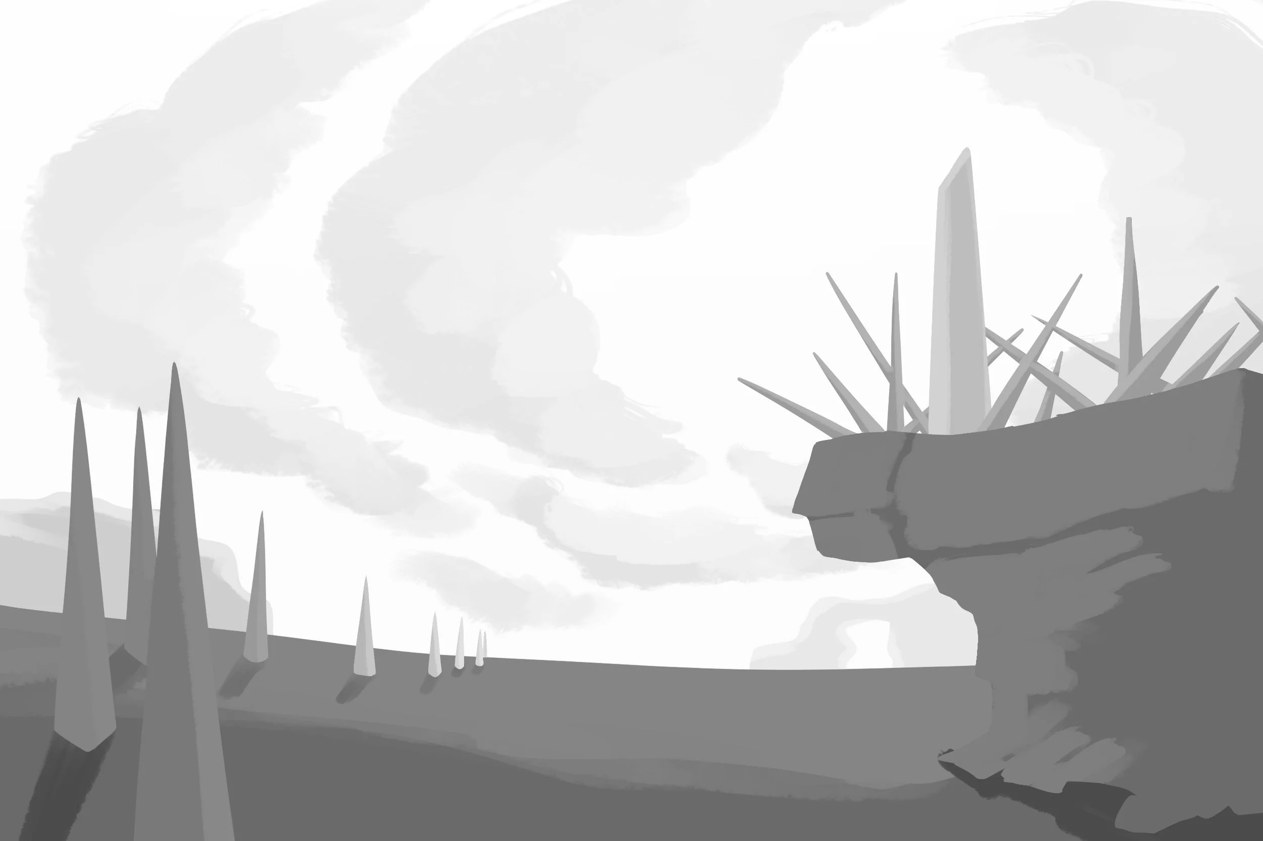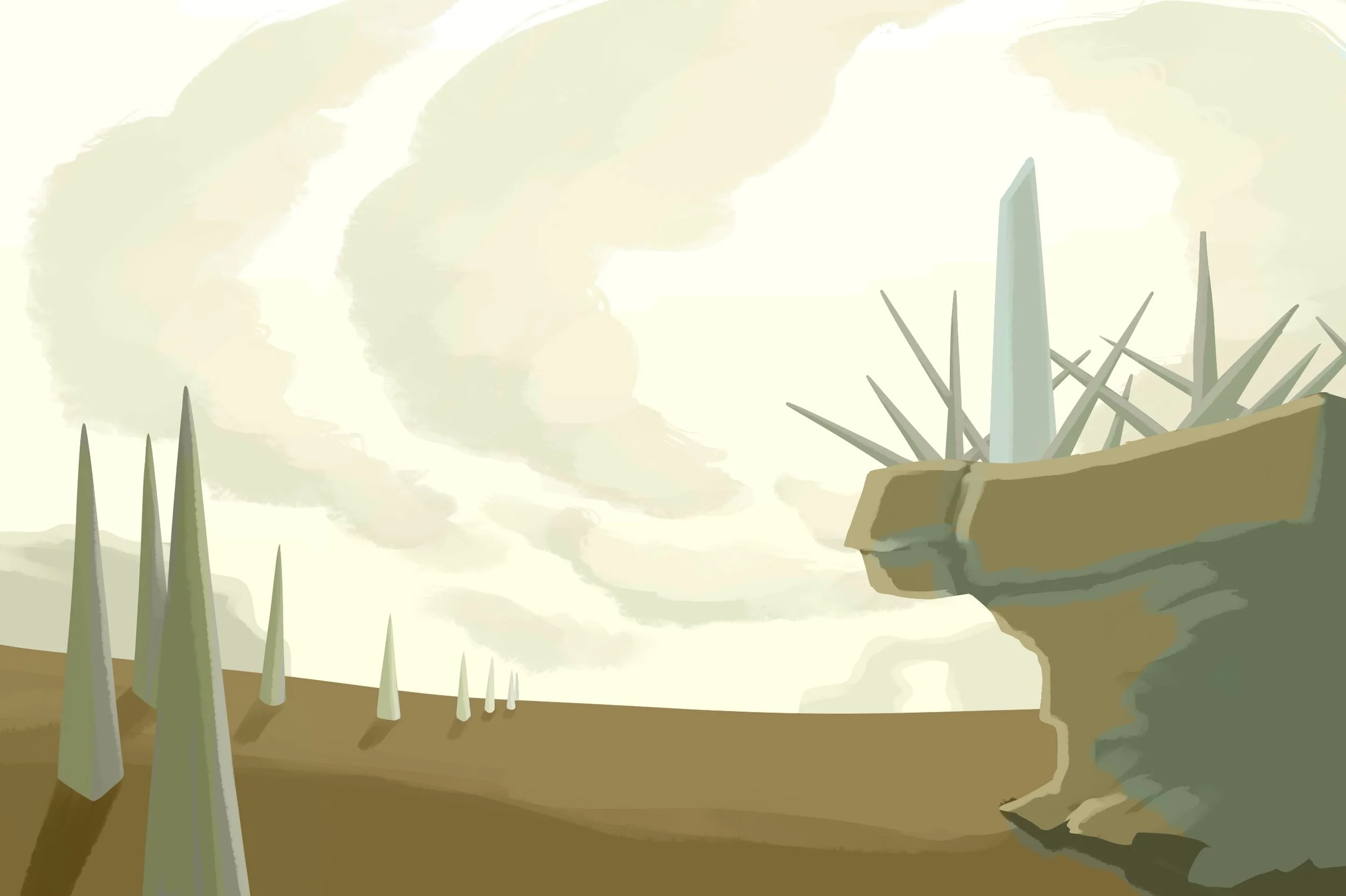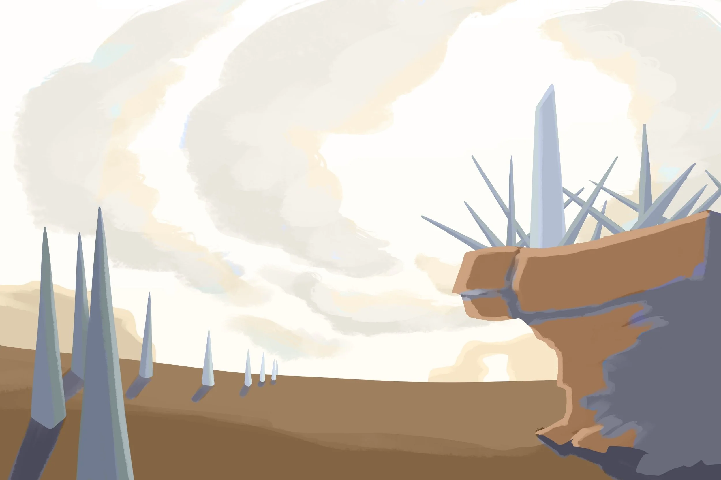 I wanted to create a place that made the viewer feel like they shouldn’t be there. The metal spikes are the most obvious example of this, but not the only one. There is a complete lack of vegetation, the only animals around are the birds flying overhead, the writing is in an unrecognizable language, and there is nothing else around the viewer for miles. Even the slightly unnatural formation of the clouds and the glowing dots around the pillar add to the overall mood of the piece.