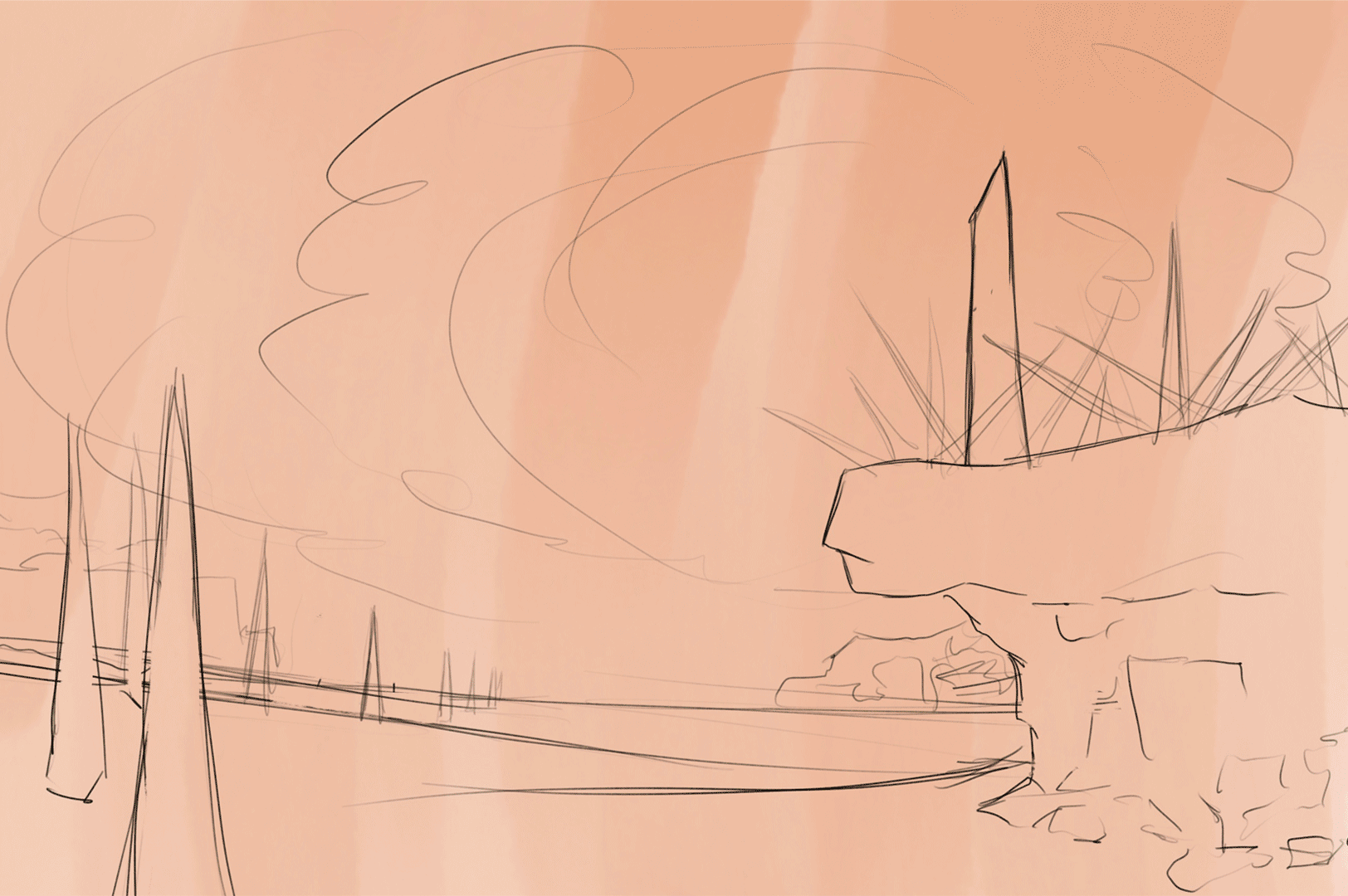The initial concept for this painting was something I had come up with a few months prior to making it. I had made an illustration back then, but I felt I could do the concept more justice with a different aspect ratio and composition. The original idea and layout was inspired by travel posters, whereas this time around I wanted to really immerse the viewer in the art. I looked back at my old thumbnails and found a composition that appealed to me, before expanding it to fit the new canvas size.
