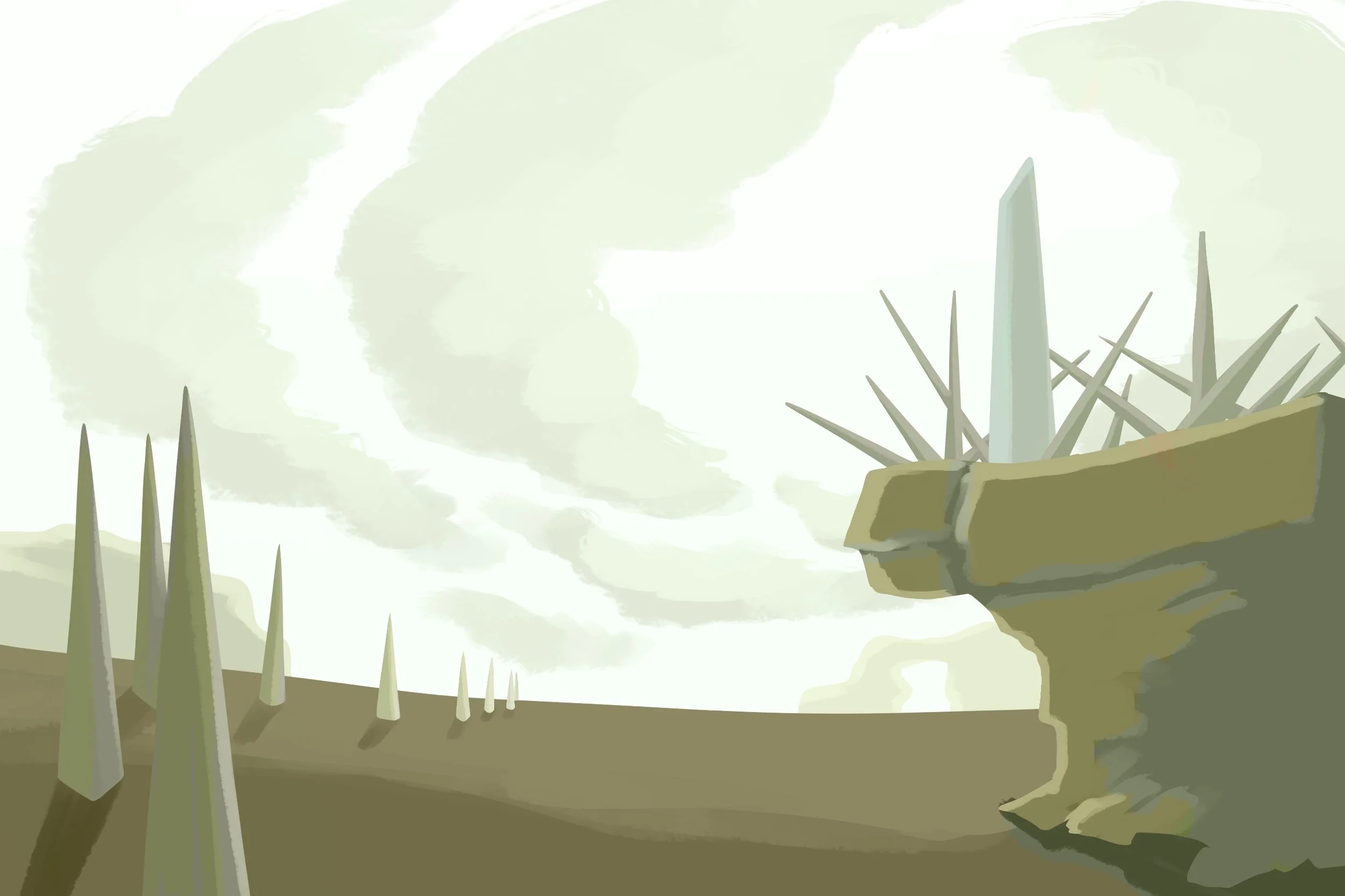 This painting was heavily inspired by the 1993 Sandia Report, which discusses how we could possibly warn future, or even alien, civilizations about the dangers of nuclear waste sites and radiation. The report brings up things like hostile architecture, written warnings, and providing information. While the warnings and information are interesting, the hostile architecture is what really drew me into this concept.